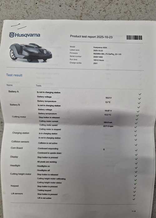 Used 450x Automower® (2020) which has done 10512 hours so far. Serviced annually, sold and installed by Ace Farm Supplies from new. Includes docking station and transformer. Installation can be arranged at extra cost.